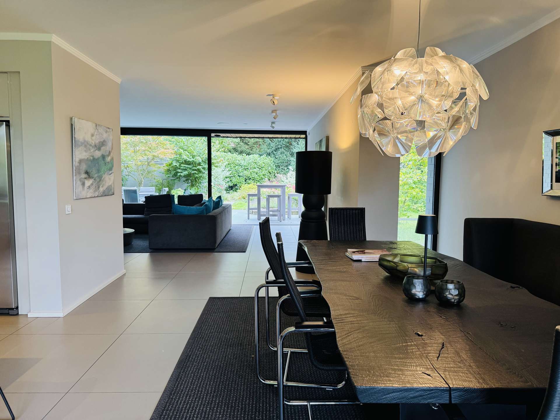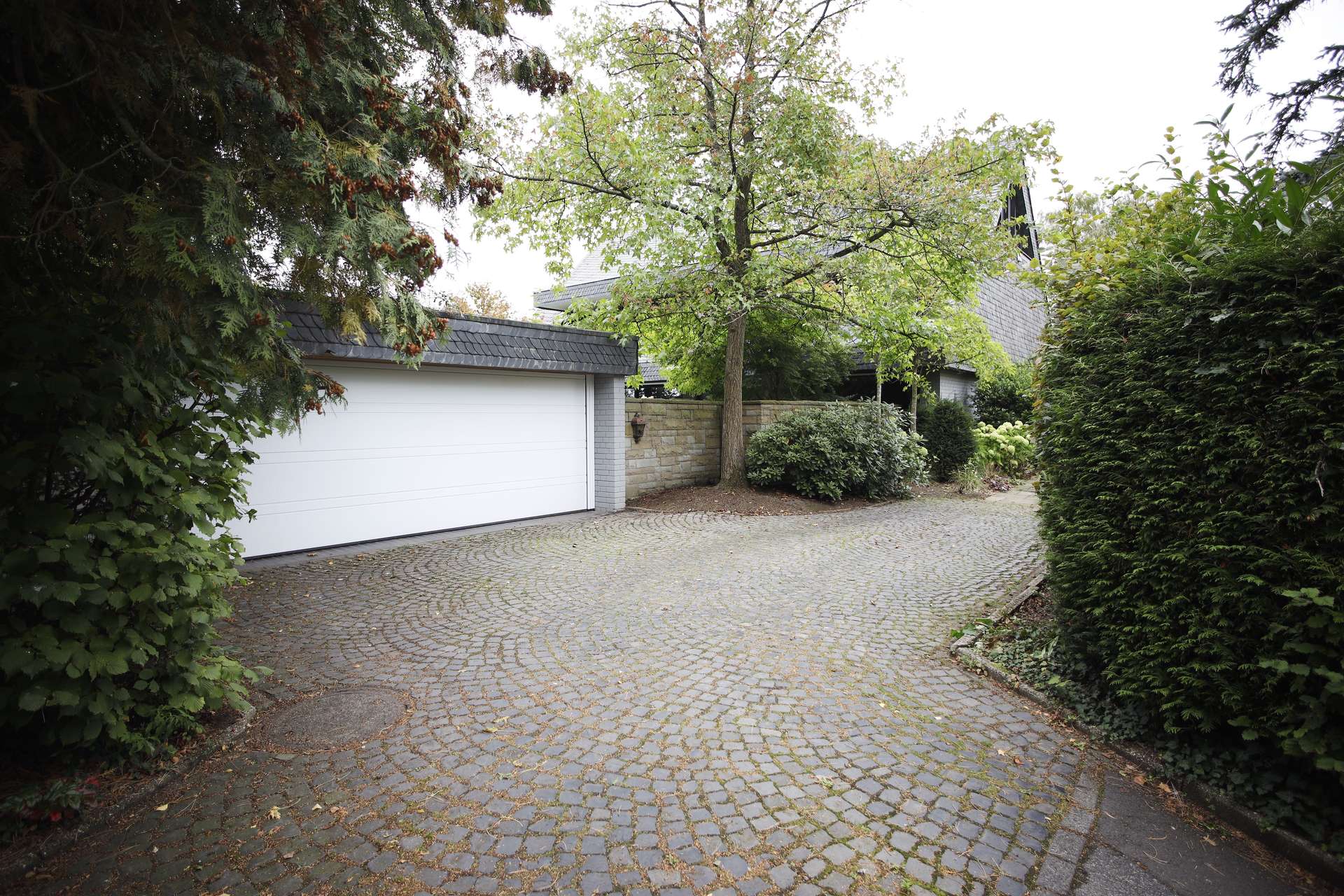 Der parkähnliche, uneinsehbare Garten umschließt das Gebäude harmonisch und macht die Grenzen zwischen Innen- und Außenraum fließend. Die Einfahrt über eine kleine Privatstraße und die Doppelgarage unterstreichen die Exklusivität und Diskretion, die dieses Anwesen bietet.