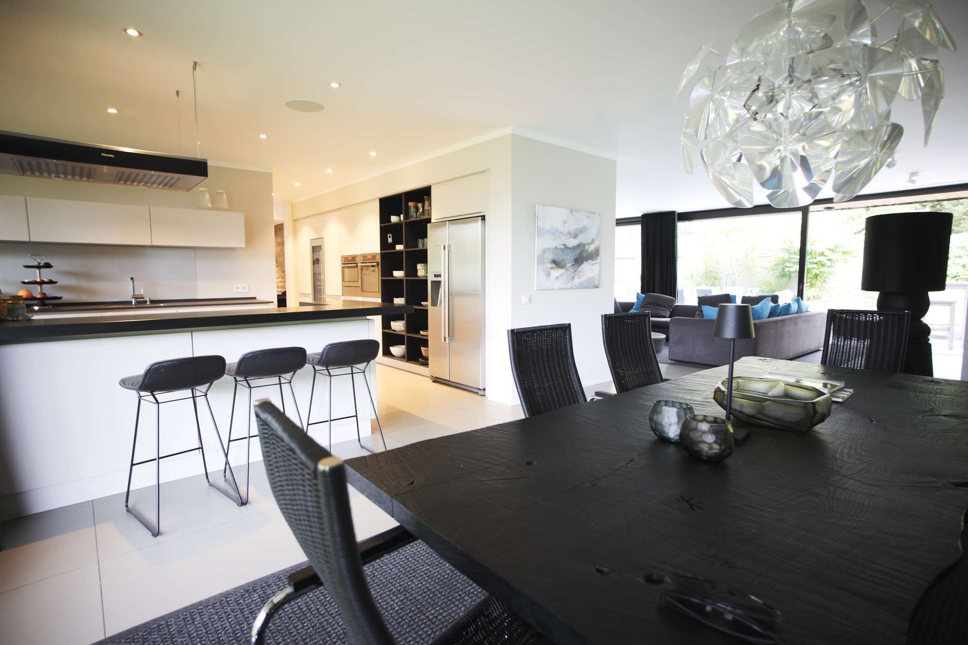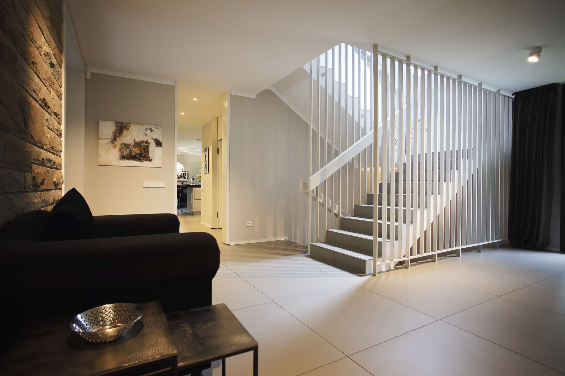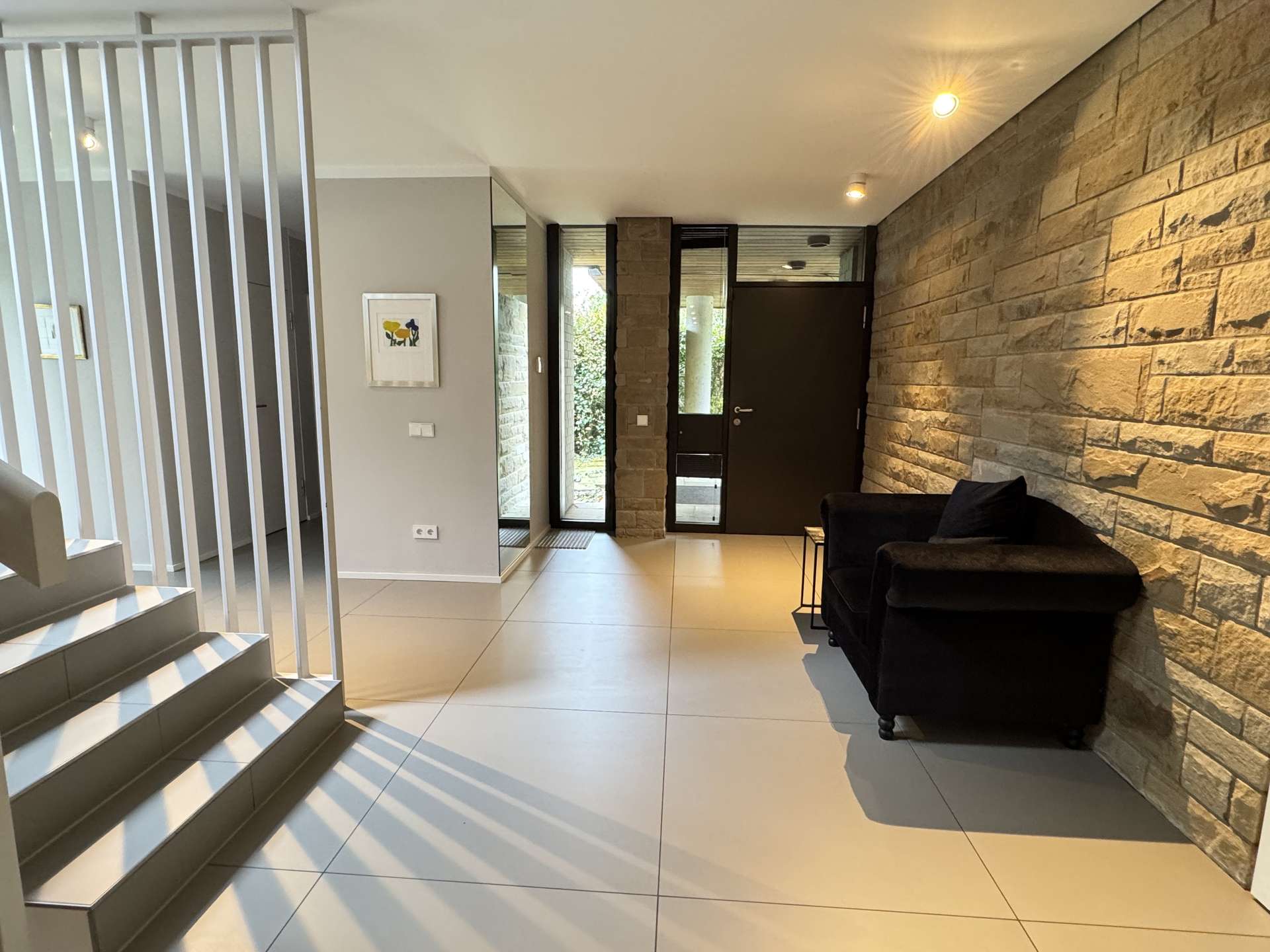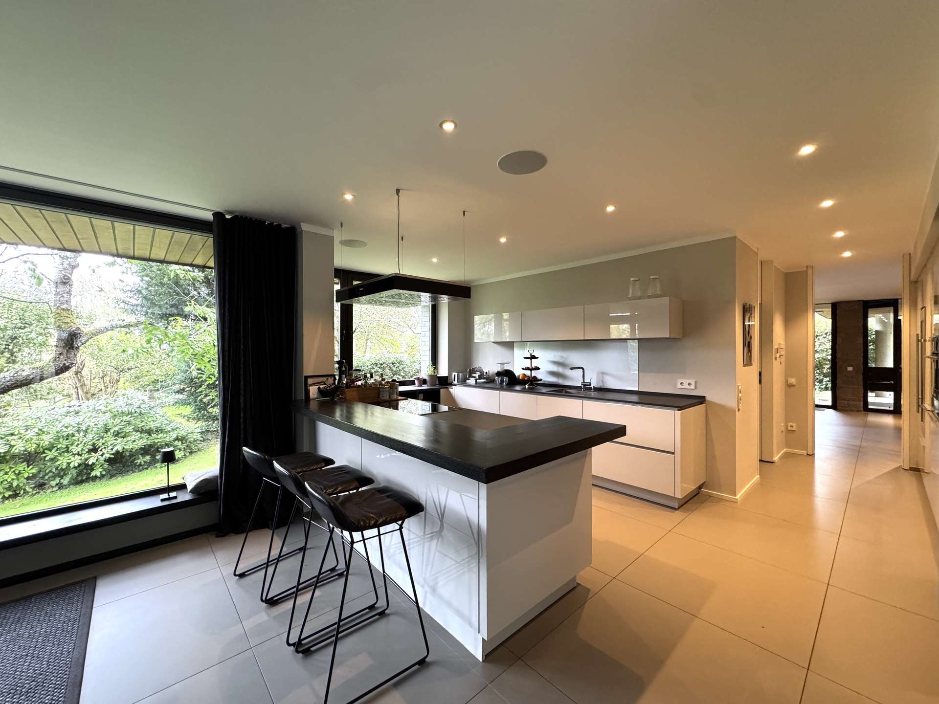 Die ca. 380 m² Wohnfläche verteilen sich über mehrere Ebenen, die bewusst klare Funktionsbereiche definieren und gleichzeitig fließende Übergänge zulassen. Der lichtdurchflutete Eingangsbereich mit offenem Treppenhaus führt in einen repräsentativen Wohnbereich mit Kamin und Blick in den weitläufigen Garten. Die große Designküche mit Kochinsel, Weinkühlschrank, Dampfgarer, amerikanischem Kühlschrank und einer angrenzenden Nebenküche bietet anspruchsvolle Funktionalität und elegante Ästhetik zugleich.