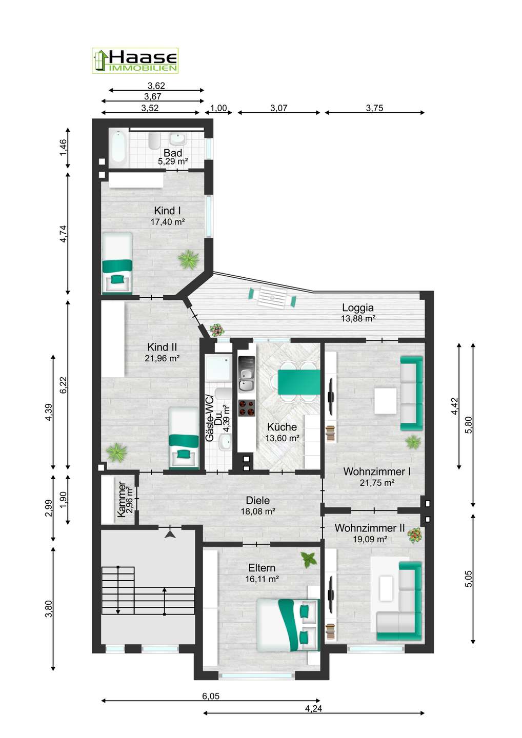 Die Wohnung bietet ca. 147,55 m² Wohnfläche und umfasst fünf Zimmer. Der aktuelle Grundriss sieht drei Schlafzimmer sowie einen großzügigen Wohn- und Essbereich vor. Ergänzt wird das Raumangebot durch eine große Loggia.