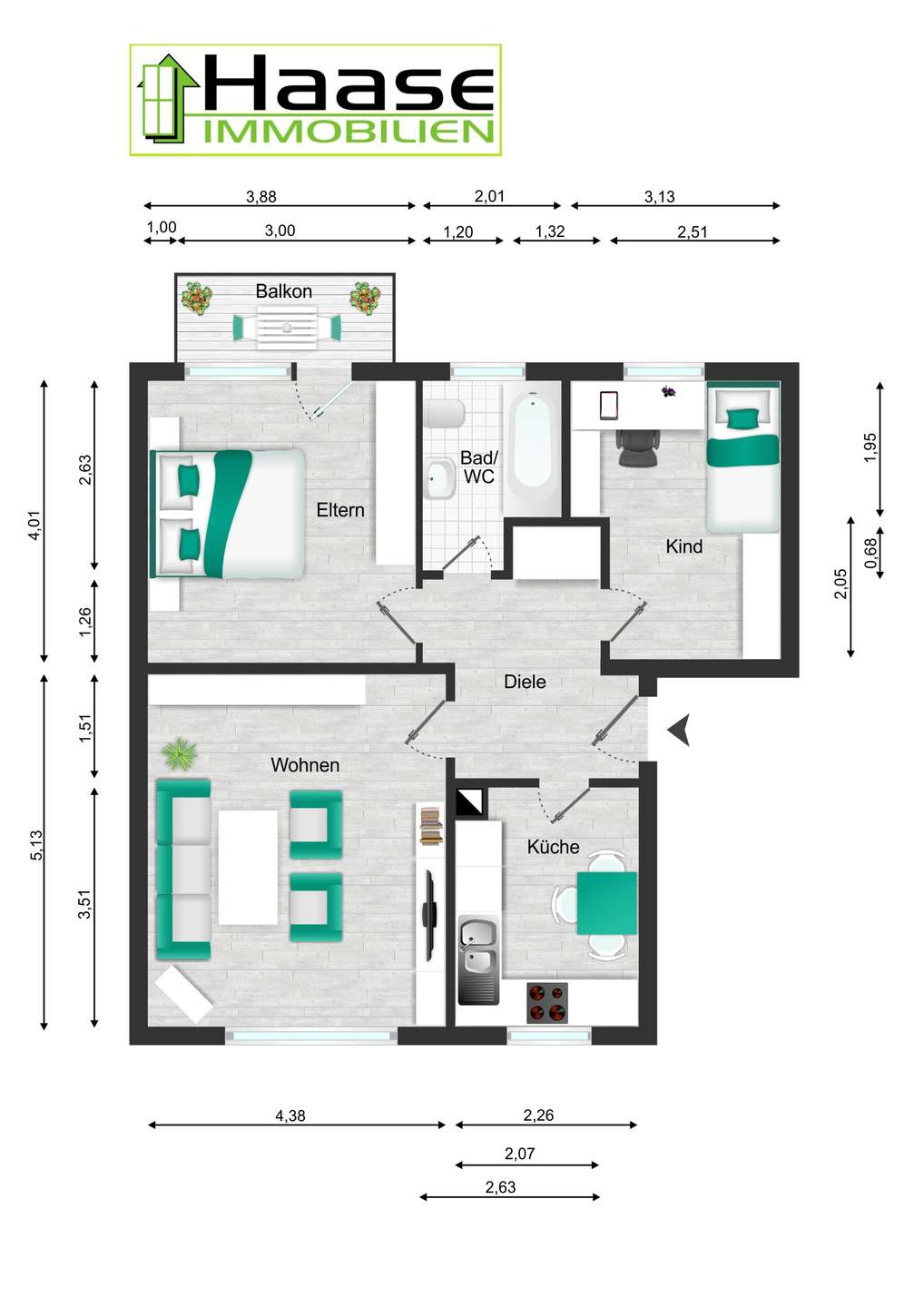 • Wohnung teilweise vermietet / teilweise frei verfügbar